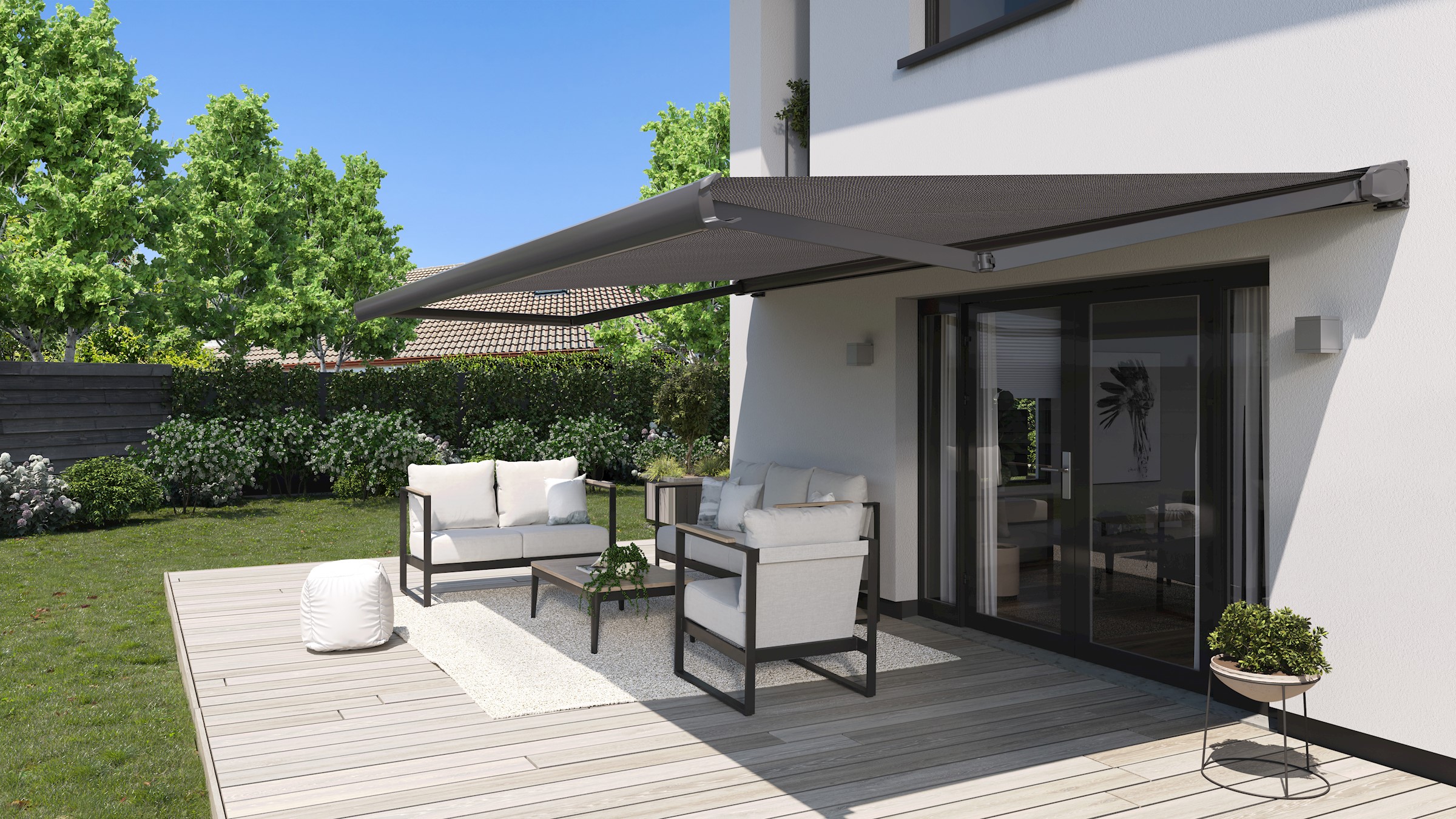 Geniet van een schaduwrijk terras met onze stijlvolle knikarmschermen. Perfect voor het creëren van een comfortabele buitenruimte.